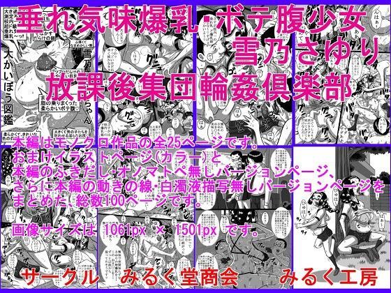 人一倍、体力の無い少女、雪乃さゆりちゃん。体育の授業で、彼女は校内ランニングの真っ最中。地元でも最大級、と噂される弩級の爆乳を振り乱し、自身がコンプレックスを抱いている脂ののりまくったボテボテの大きなお腹は、体操着がはだけて露わになっていました。彼女は汗だく、意識朦朧のフラフラの状態で、独り校舎裏を走っていました。失神寸前のさゆりちゃんがつまづいて倒れた所に、待ち構えていた三人組の男の子たちに抱きかかえられ、彼女は人気の無い校舎裏の用具倉庫に連れ込まれます。